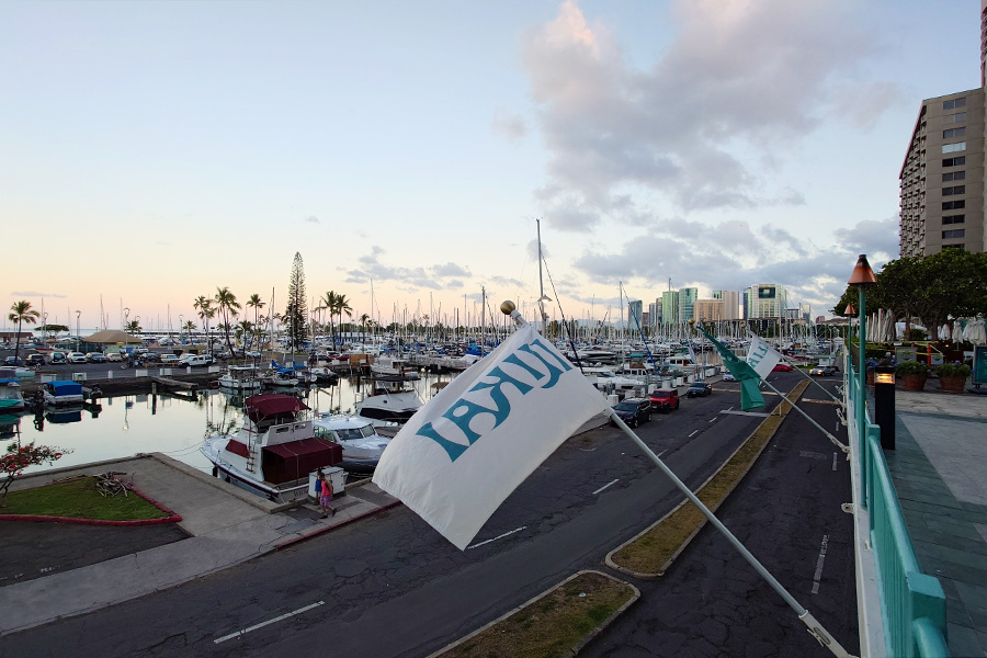 テラスの先っちょまで出てきて、イリカイ前のボートハーバーを眺めます。