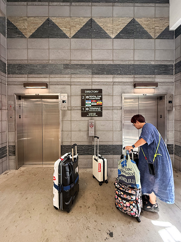 ターミナル1から長いこと歩いてやっとレンタカーセンターのエレベーターに到着しました。